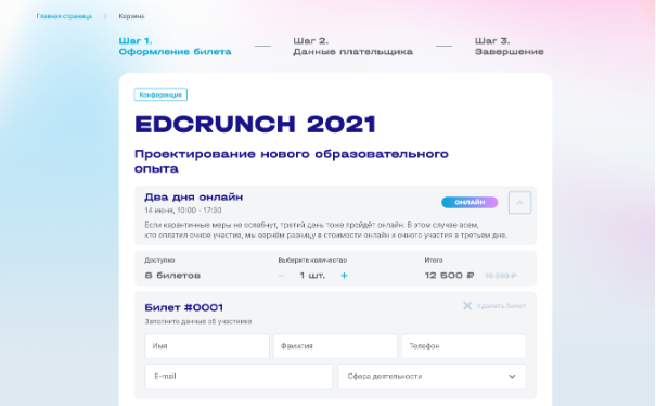 Для покупки билетов мы учли несколько основных сценариев, один из которых — учебное заведение оформляет несколько билетов своим сотрудникам. В этом случае плательщиком выступает один пользователь, а владельцами билетов и участниками — другие.