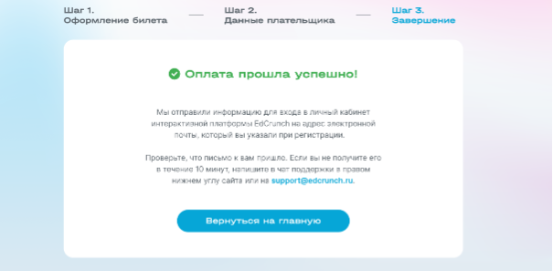 Ну, и в финале плательщик получал чек и информацию по покупке на почту, а участники — свои билеты и инструкции для входа.