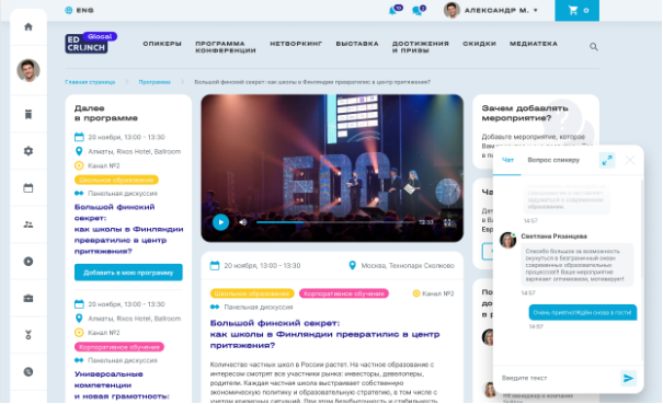 Для пользовательского чата сделали постмодерацию, а вопросы спикерам — аналогичный чат, но с премодерацией. Вопросы спикерам автоматически привязывались к конкретному мероприятию, чтобы спикеры могли ответить на них и после окончания конференции.