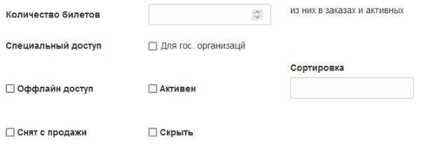 Количество билетов по квоте было ограничено, настройки билетов при их создании позволяли не только определить его тип, но и ограничить максимальное количество оформленных билетов, позволяли управлять их видимостью и активностью.
