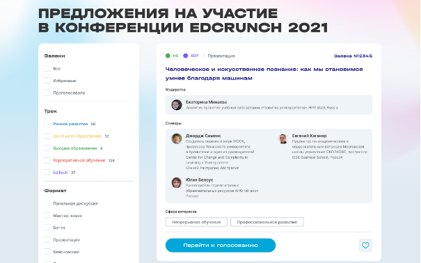 Первым этапом был разработан EdCrunch Box — отдельный сервис для сбора заявок и идей от потенциальных спикеров конференции и голосования за отдельные идеи.