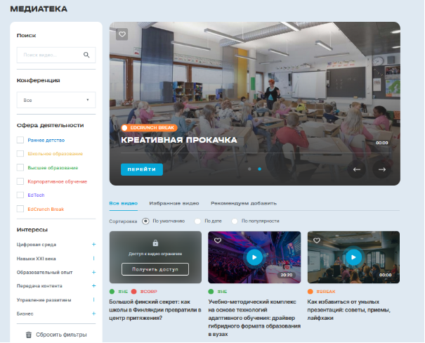 Платформа должна жить не только во время проведения конференций, но и в другие дни. Мы реализовали каталог видео с конференций и механизм подписки на эти видео.