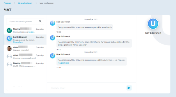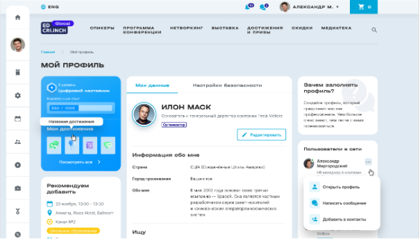 Кроме чатов, пользователи могут находить себе единомышленников на платформе EdCrunch и общаться с ними в личных сообщениях. Гибкий фильтр позволяет найти наиболее интересных для общения коллег.