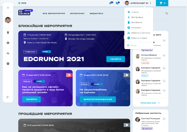 На главной странице личного кабинета, или дешборде, выводятся все будущие и прошедшие мероприятия, рекомендации мероприятий, видео из базы записей и прочая общая информация.
