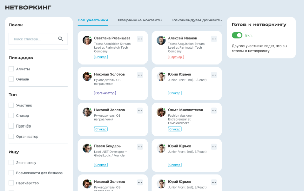 В текущей версии платформы мы пришли к более универсальному принципу: все, кто будет хоть как-то взаимодействовать с платформой конференции, становятся её пользователями.