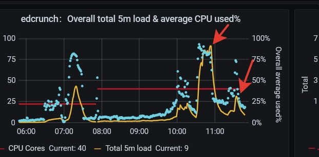 Кто помнит предыдущую версию эдкранча, там мы изрядно поседели, когда в первый день конференции сервер с 40 ядрами не справился с нагрузкой и решил прилечь на пол часа. Вот эта прекрасная картинка по нагрузке, которую мы теперь показываем всем, кто хочет “hiload” на битриксе: