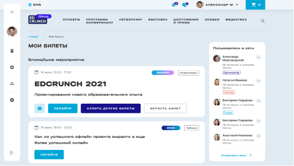 В отдельном интерфейсе собраны все билеты пользователя на все мероприятия и вебинары. Билет можно распечатать, посмотреть по нему подробную информацию, вернуть билет и т.д.